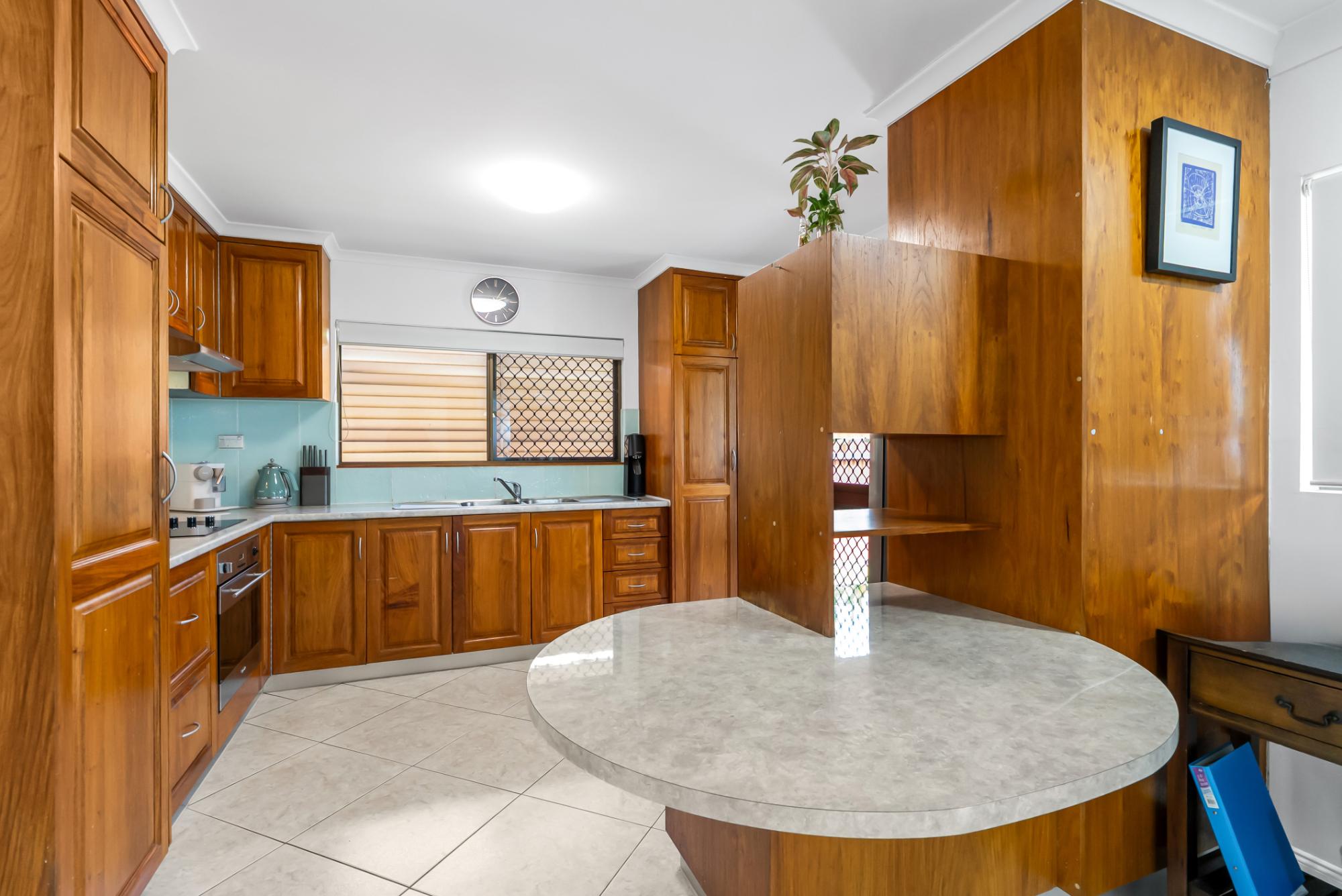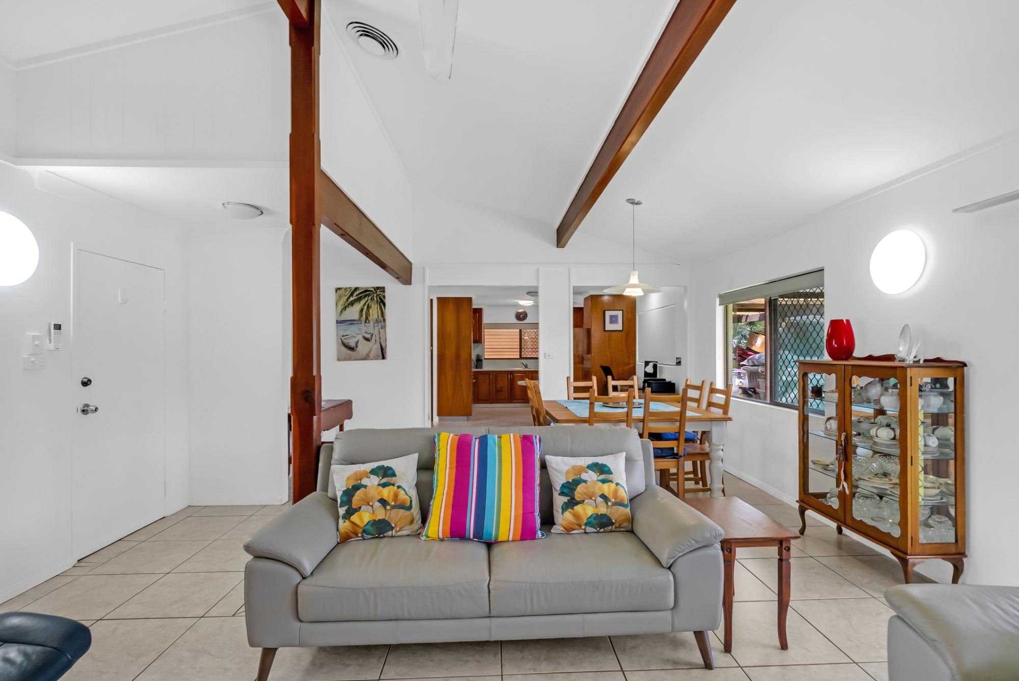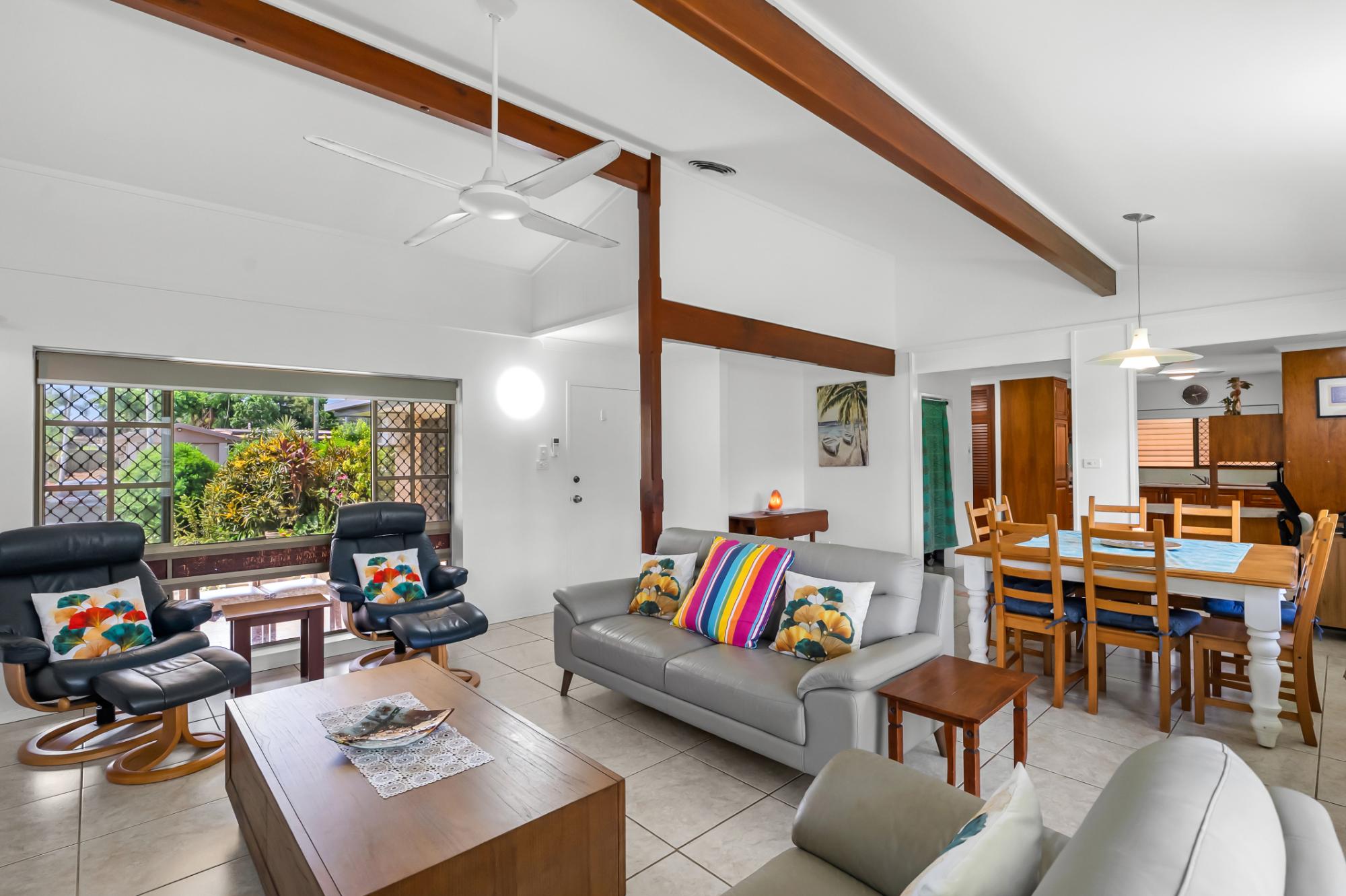 Inside, you’ll find fully tiled living areas, beautiful, exposed beam cathedral ceilings in the main living space, and stunning New Guinea rosewood cabinetry in the kitchen.