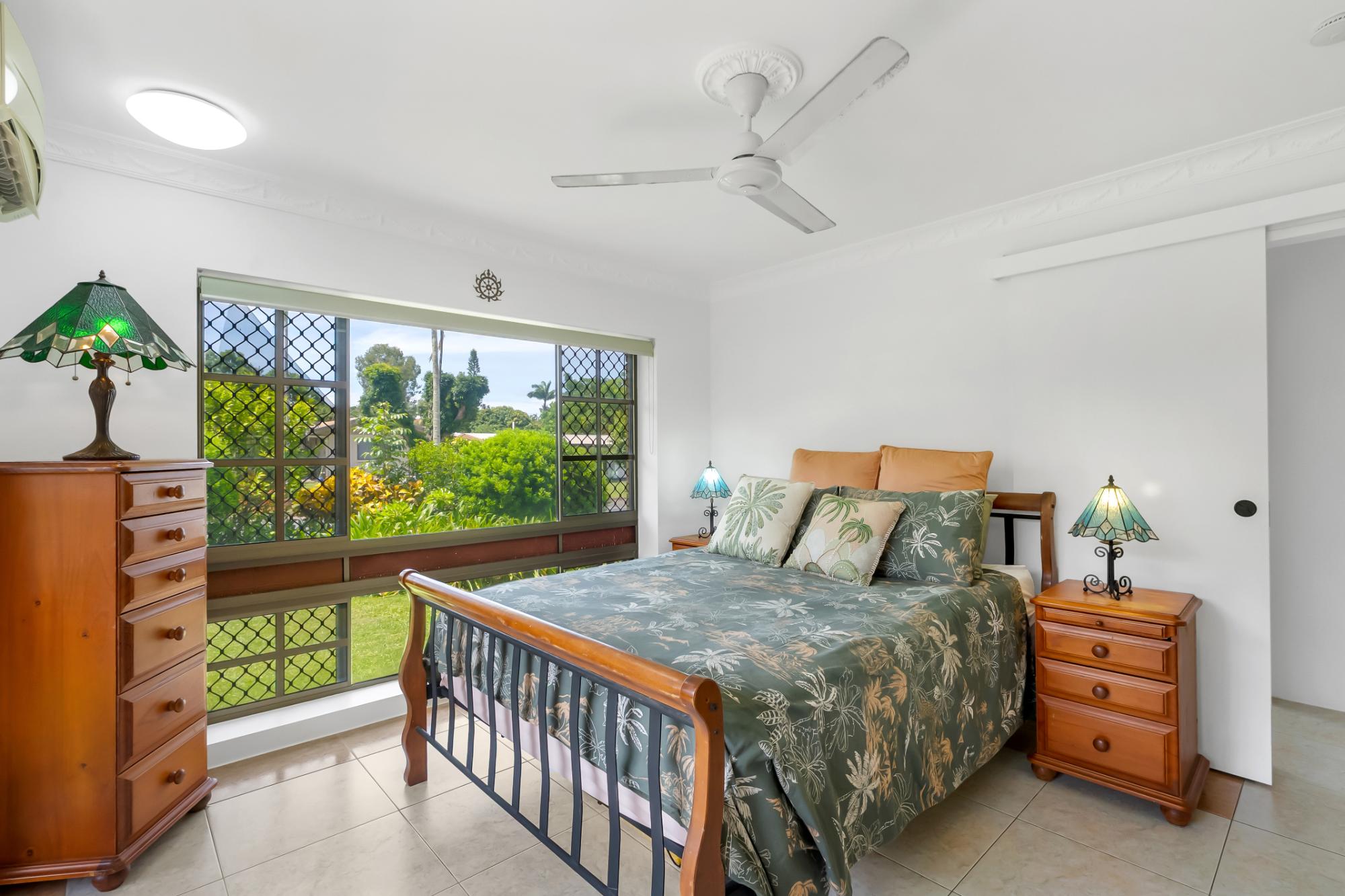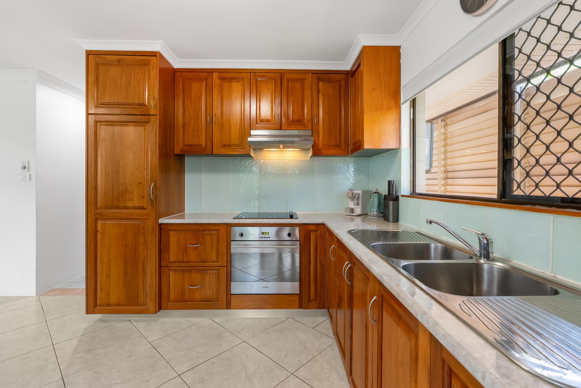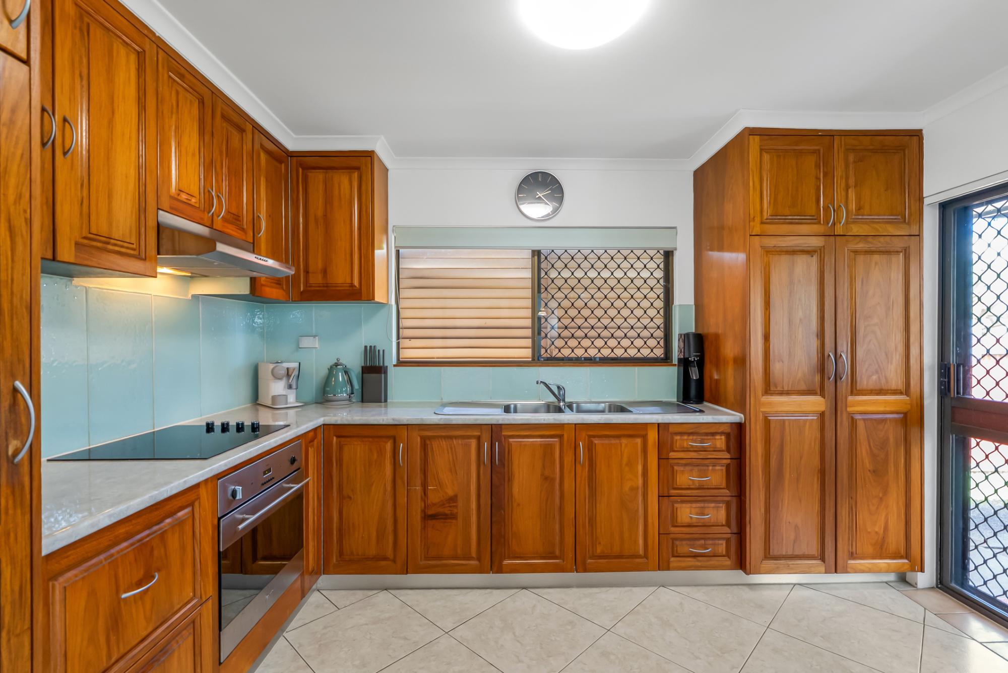 Inside, you’ll find fully tiled living areas, beautiful, exposed beam cathedral ceilings in the main living space, and stunning New Guinea rosewood cabinetry in the kitchen.